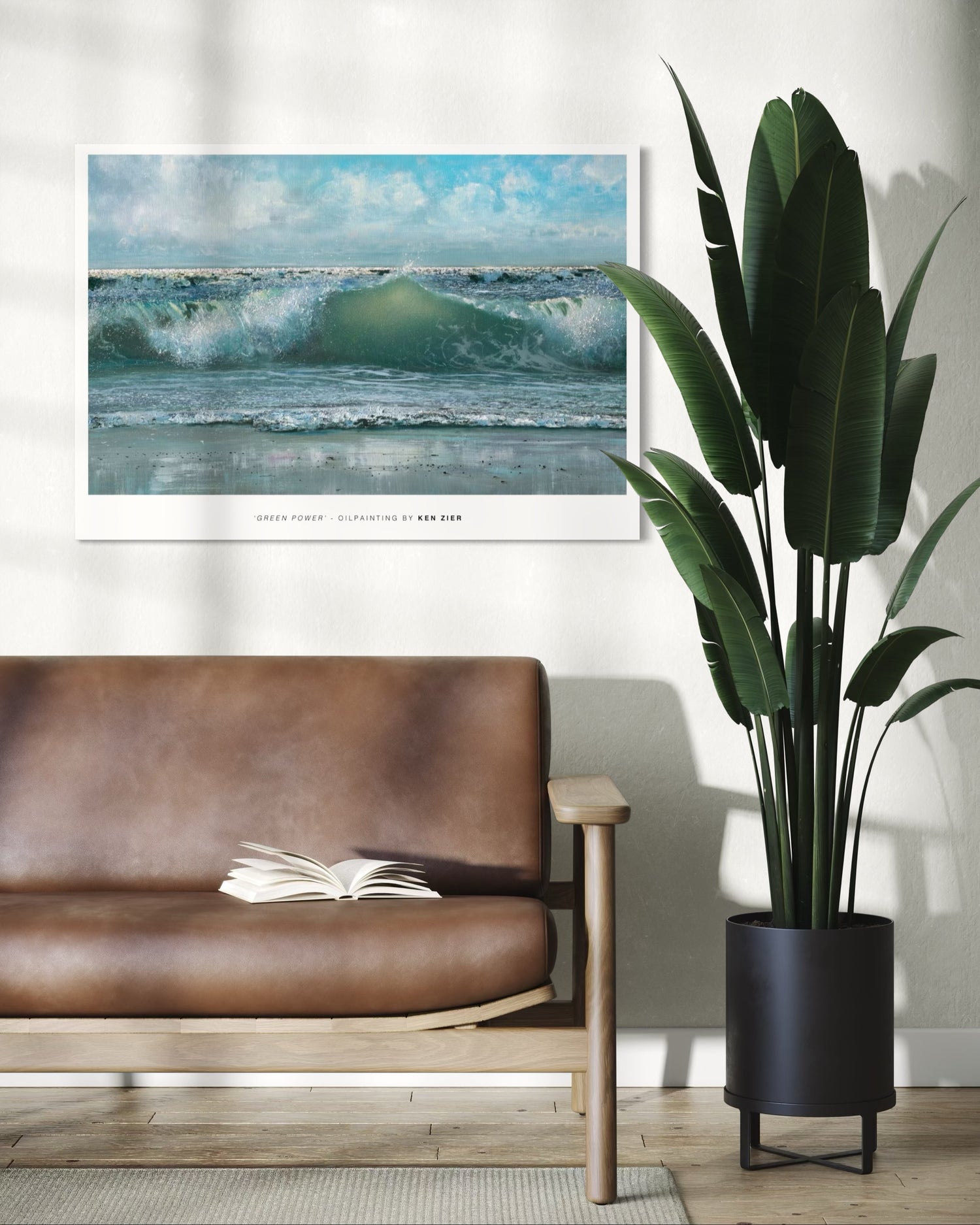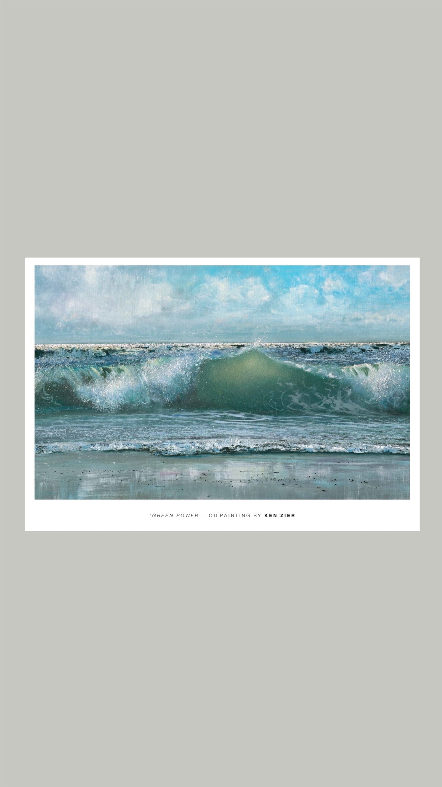 “Green Power” er den nyeste plakat i samlingen. Den er indbegrebet af Ken Ziers malerier fra vestkysten, hvor et flygtigt øjeblik, når lyset bryder igennem bølgen, er fanget. Det er når havet slår ind mod kysten, at det virkelig er tydeligt, hvor både kraftfuldt og skrøbeligt det er. “Green Power” er malet med inspiration fra den dramatiske danske vestvendte kyst i Thy, hvor Ken Zier har sommerhus.